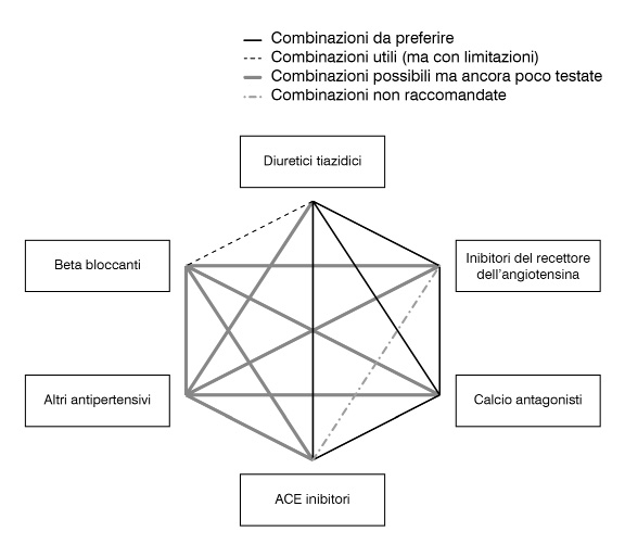 Figura 1. Possibili combinazioni tra classi di farmaci antipertensivi. Modificata da [10]